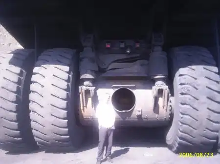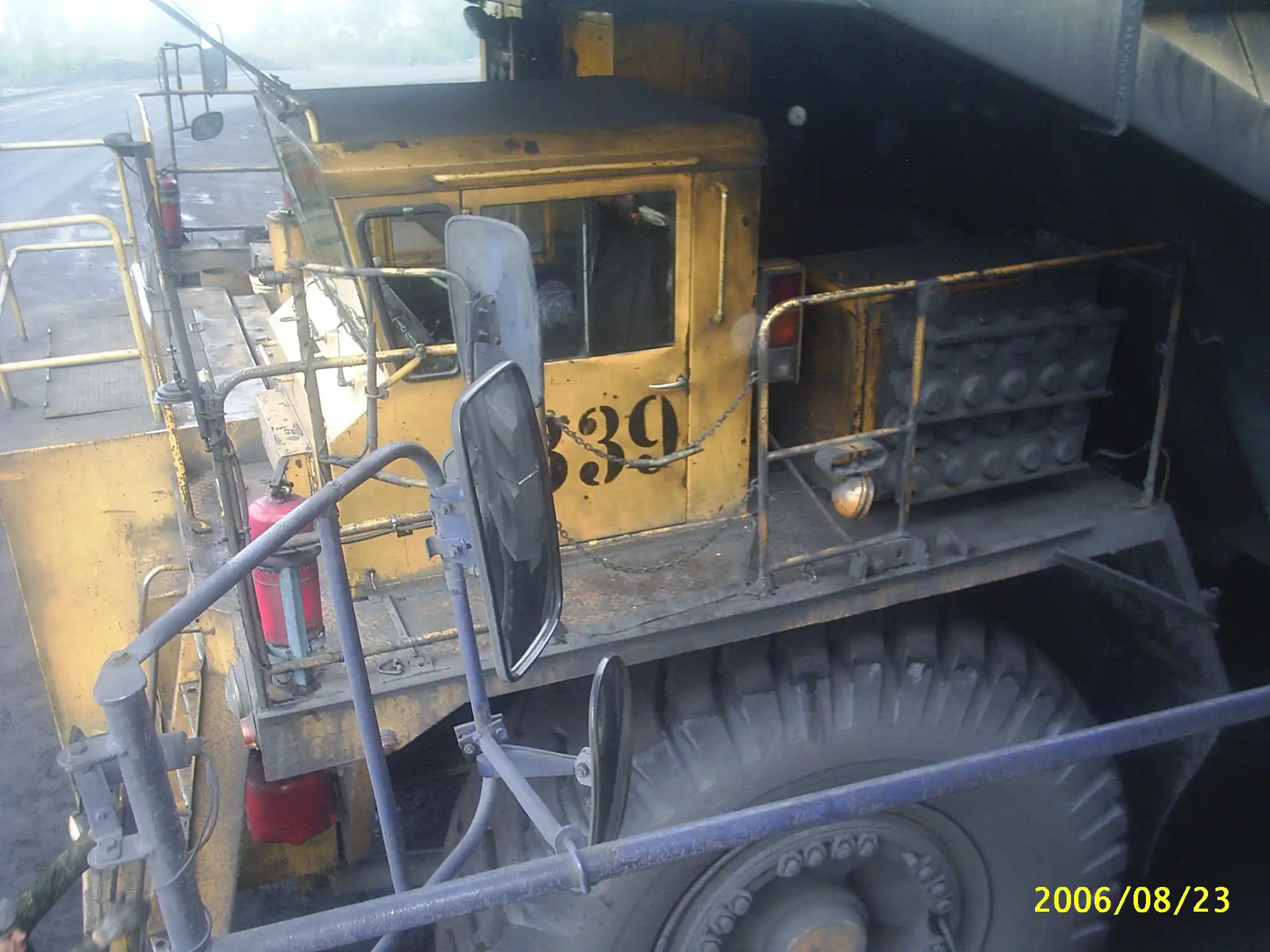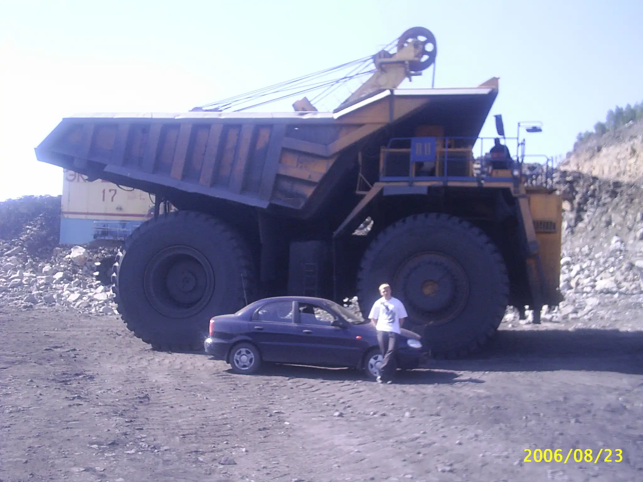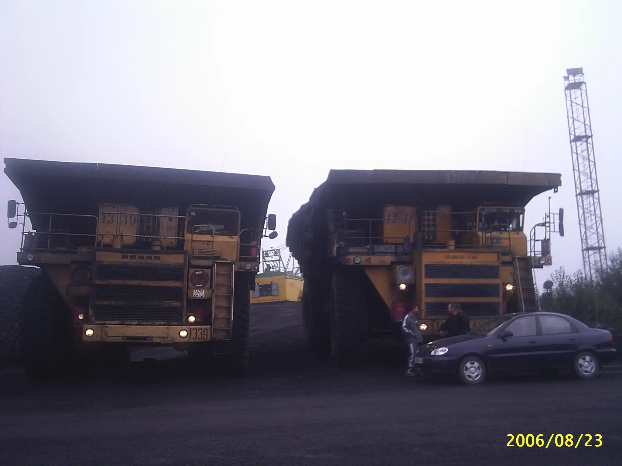 Два БелАЗа 7514-10с номерами 1339 и 1317 стоят рядом (кстати, по моей просьбе и просьбе моего отца)... На переднем фоне легковой автомобиль Chevrolet Lanos.
