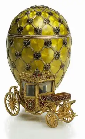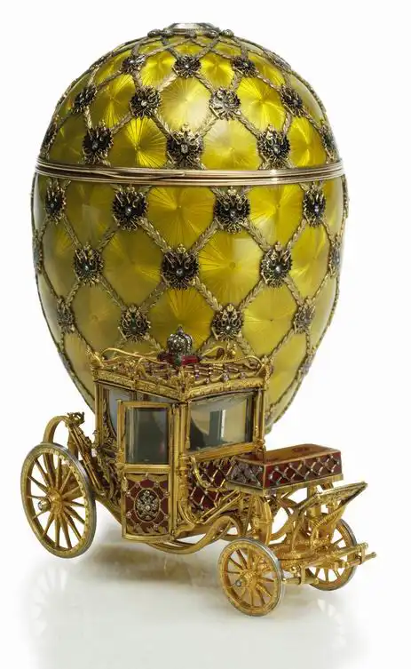 Сюрприз в раскрывающемся яйце сделан в виде точной миниатюрной копии кареты в которой в которой ехали Николай II и императрица Александра Федоровна. Цветовая гамма яйца напоминает коронационное платье, двери кареты открываются, ступеньки складываются, окна - из хрусталя. Говорят, над этой каретой мастер работал в течении 15 месяцев. Самое дорогое яйцо в коллекции. Предварительная стоимость на аукционе: $18,000,000-24,000,000.