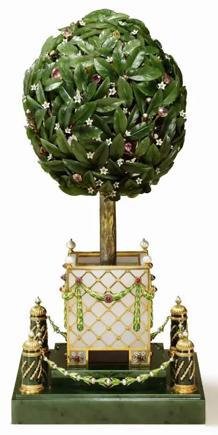 Императорское Пасхальное Яйцо, подаренное Царем Николаемм II его матери Вдове Императрице Марии Феодоровне в 1911 на Пасху. Фирма Фаберже. Санкт-Петербург 1911. Золото, нефрит, аметисты, рубины, цитрины, алмазы, кварц, жемчуг, эмаль. Высота 29,8 см. Предварительная стоимость на аукционе: $10,000,000-15,000,000.