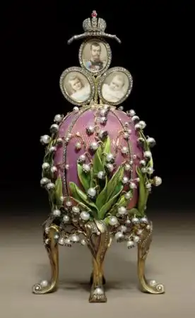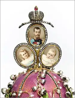 C портретом Николая II и его детей, подаренное царем своей жене императрице Александре Федоровне на Пасху 1898 года. Фирма Фаберже. Санкт-Петербург 1898. Мастер Михаил Перхин. Золото, алмазы, жемчуг, эмаль. Высота 20 см. На мой взгляд самое красивое яйцо из коллекции. Секрет приводится в действие одним из цветков- жемчужин. При нажимании на цветок корона поднимается и открывает трилистник с портретами выполнеными акварелью на эмали. Удивительной красоты вещь. Предварительная стоимость на аукционе: $12,000,000-18,000,000.