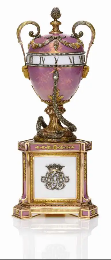 Пасхальное яйцо из разноцветного золота покрытое эмалью украшеное драгоценными камнями. Фирма Фаберже. Санкт-Петербург 1902. Мастер Михаил Перхин. Золото, алмазы, жемчуг, эмаль. Высота 23,5 см. Вроде единственное яйцо изготовленное по заказу иностранного гражданина - герцогини Марлборо. Циферблат часов нанесен по окружности яйца и вращается. Часовая стрелка неподвижна, сделана ввиде змейки, усыпаной алмазами указывает на текущий час. На этом яйце особенно заметна красота эмали.