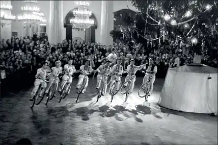 1952. Советский цирк умеет делать чудеса. Акробаты на велосипедах цепью едут вокруг главной елки страны