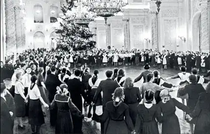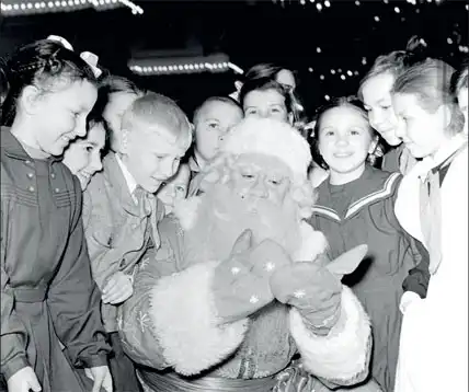 1937. Дед Мороз держит в руке «Курс истории ВКП(б)». Ученики 5-го класса школы №15 Октябрьского района Москвы радуются празднику