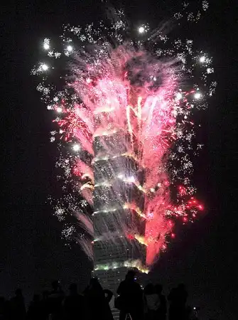 Фейерверки на самом высоком в мире здании в Тайпее (Тайвань).