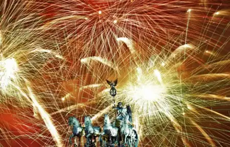 Невероятное огненное шоу в небе над Бранденбургскими воротами (Берлин, Германия).