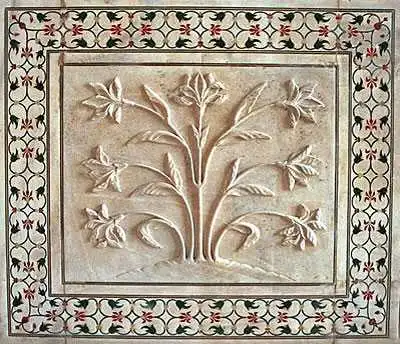 Сплетенные в изысканный орнамент стебли растений и вязь арабских букв, выложенных черным мрамором.