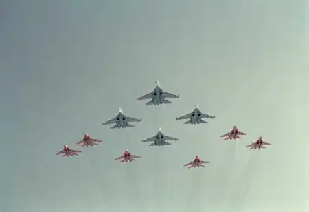 В мае 1989 г. на вооружение 1 -й авиационной эскадрильи Центра (в то время - 237-го смешанного авиаполка) поступили истребители Су-27. Освоение нового самолета летчиками шло быстро, и вскоре были выполнены первые тренировочные полеты в составе пары, тройки, а затем и четверки самолетов в строю "ромб". Ведущим первого ромба стал Анатолий Арестов, левым ведомым - Александр Дятлов, правым - Иван Кирсанов, хвостовым ведомым - Владимир Букин. Оказалось, что удерживать Су-27 в плотном строю при маневрировании группы намного сложнее, чем, например, МиГ-29. Причин тому было несколько: большие размеры, вес, а значит и инертность самолета, особенности работы электродистанционной системы управления самолетом и, как ни странно, его великолепная аэродинамика. Сложностей было много. Но как велико было желание летчиков делать на нем то, что до этого выполняли в Кубинке на МиГ-19, МиГ-21, МиГ-23 и МиГ-29!