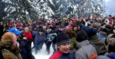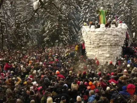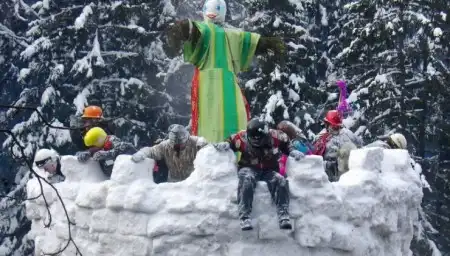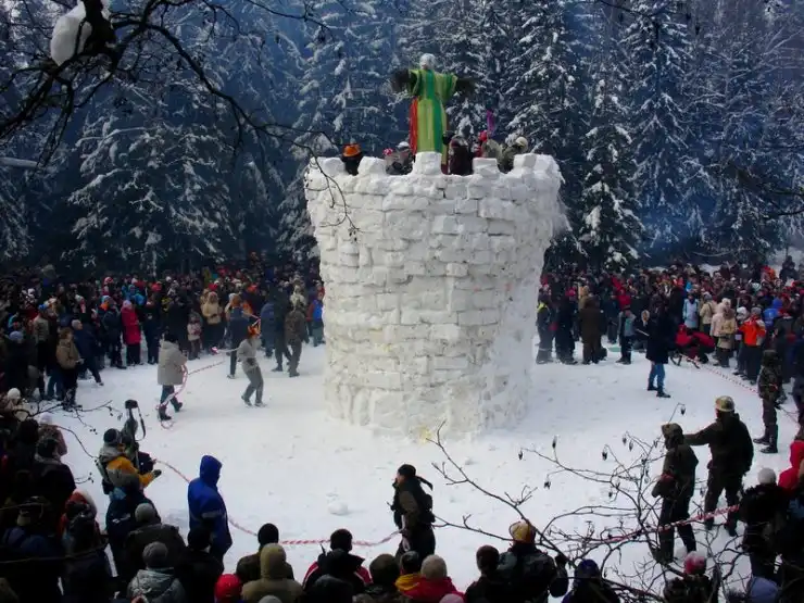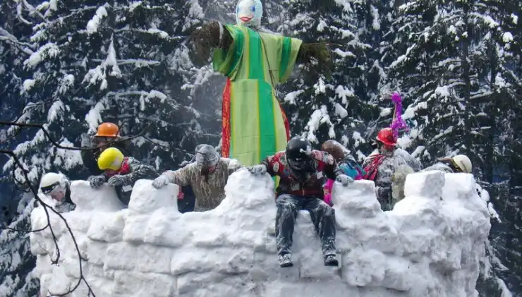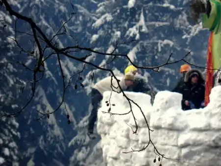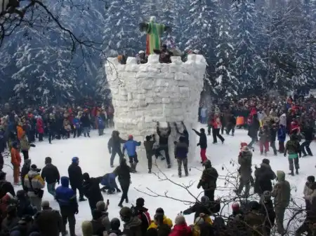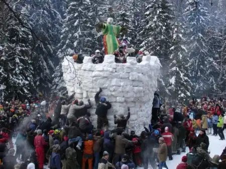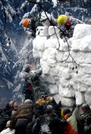 Наверху сидят защитники крепости - сталкивают добравшихся, посыпают их сверху снегом, дразнят, красуются. Одного, правда, умудрились оттуда скинуть - слишком далеко высунулся - улетел с шести метров в толпу. Жив.