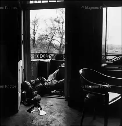 На одной из фотографий, сделанной Робертом Капой, запечатлен американский автоматчик в Лейпциге, поливающий с балкона очередями немецких снайперов. На следующем фото изображен тот же молодой солдат, но уже лежащий мертвым.