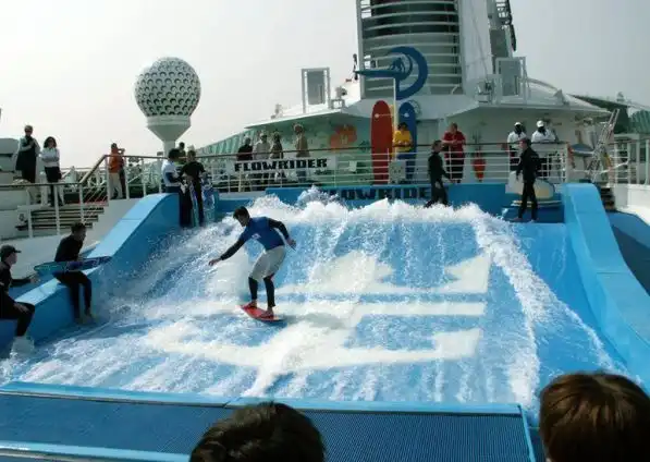 Целая палуба лайнера отведена под настоящий АКВАПАРК! Здесь помимо многочисленных бассейнов с водными горками для детей и взрослых, имеется уникальный бассейн с искусственной волной для занятий серфингом. Пассажиры лайнера могут вдоволь насладиться такими водными развлечениями как «Зона H2O» - интерактивные фонтаны, каналы для катания на кругах, бассейны с искусственным течением, бассейны с каскадными водопадами…Фантастические джакузи с горячей водой и прозрачным дном в Солярии , оформленной в стиле джунглей, позволяют видеть водную гладь, по которой совершает круиз наш лайнер… Джакузи расположены на расстоянии 3,5 метров от борта лайнера и на высоте 34 метра над уровнем моря.