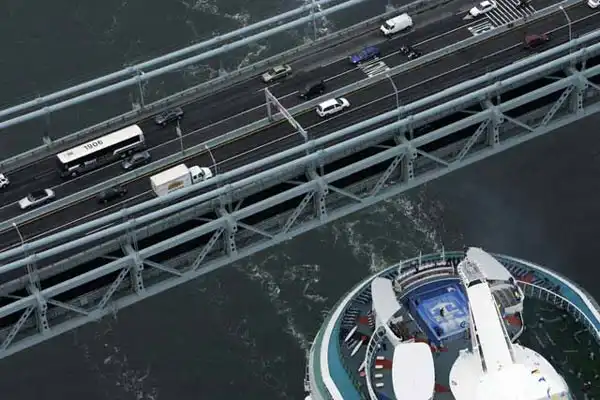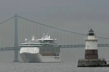 Лайнер проходит под мостом через пролив Веррацано. На ближнем плане – маяк Robin"s Reef.