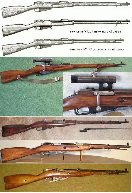 осталась в США и была продана на гражданском рынке оружия или использовалась для первоначального обучения солдат в армии. Внешне винтовки американского заказа, кроме маркировки, отличались от отечественных материалом ложи - они имели ореховые ложи вместо березовых. Первую модернизацию винтовки образца 1891 года перенесли в 1908 - 1910 году, когда в связи с принятием на вооружение нового варианта патрона с остроконечной пулей и улучшенной баллистикой винтовки получили новые прицелы. Кроме того, были внесены и другие незначительные изменения, вроде новой конструкции ложевых колец. Новые винтовки получили обозначение образец 1891-10 года и во всех трех вариантах служили вплоть до 1923 года, когда командование Красной Армии в целях унификации приняло решение оставить на вооружении только драгунскую винтовку, которая и оставалась основным индивидуальным оружием пехоты вплоть до 1930 года. В 1930 происходит очередная модернизация, и снова - лишь частичная. Изменяются способ крепления шомпола и штыка, но последний по прежнему постоянно должен быть примкнут к винтовке. Винтовка (к этому моменту уже официально известная не как безымянный "образец", а винтовка системы Мосина) получает новые прицельные приспособления, градуированные в метрах, а не устаревших аршинах. Снова меняется конструкция ложевых колец. Под обозначением "винтовка системы Мосина образца 1891-30 года" это оружие становится основным для Красной армии на предвоенный период и большую часть Великой Отечественной войны. В дополнение к винтовке образца 1891-30 годов в 1938 году на вооружение принимается укороченный карабин образца 1938 года, отличавшийся (кроме меньшей длины ложи и ствола) еще и отсутствием штыка.