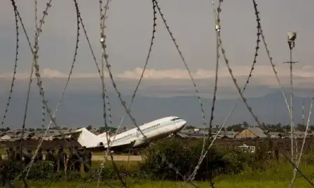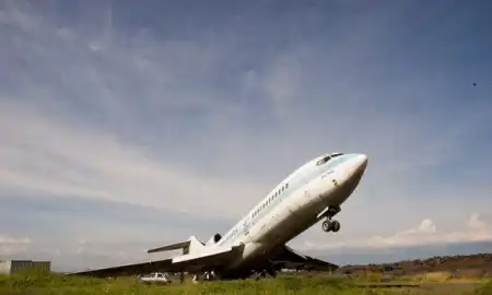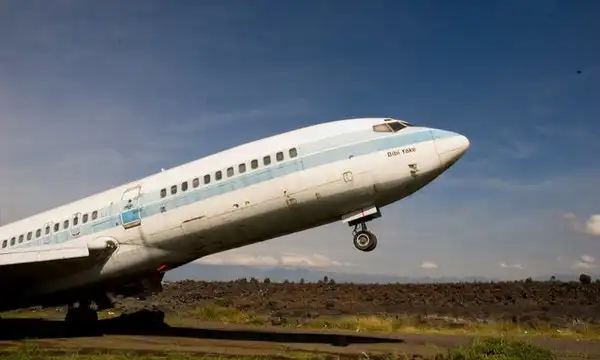 Застыл как будто собирается взлететь .... , но увы "Он уже с 2002 года стоит здесь. Обычно, правда, в горизонтальном положении. Но иногда его поднимает ветром, вот как сегодня. Потом его снова опускают. А стоит он тут, с тех пор как извергся вулкан, и пол-полосы залило лавой. Да, здесь, это конечно Гома, ДР Конго.". Далее, за самолетом, видно давно засохшую лаву. Говорят она остывала в течении двух лет. А в первое время на ней можно было жарить яичницу.