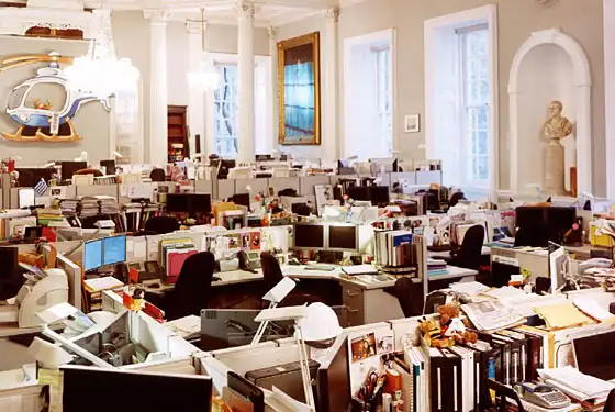 Рабочая площадь конторы, где работает мэр Нью-Йорка Майкл Блумберг, Michael Bloomberg. Блумберг не имеет отдельного закрытого кабинета.