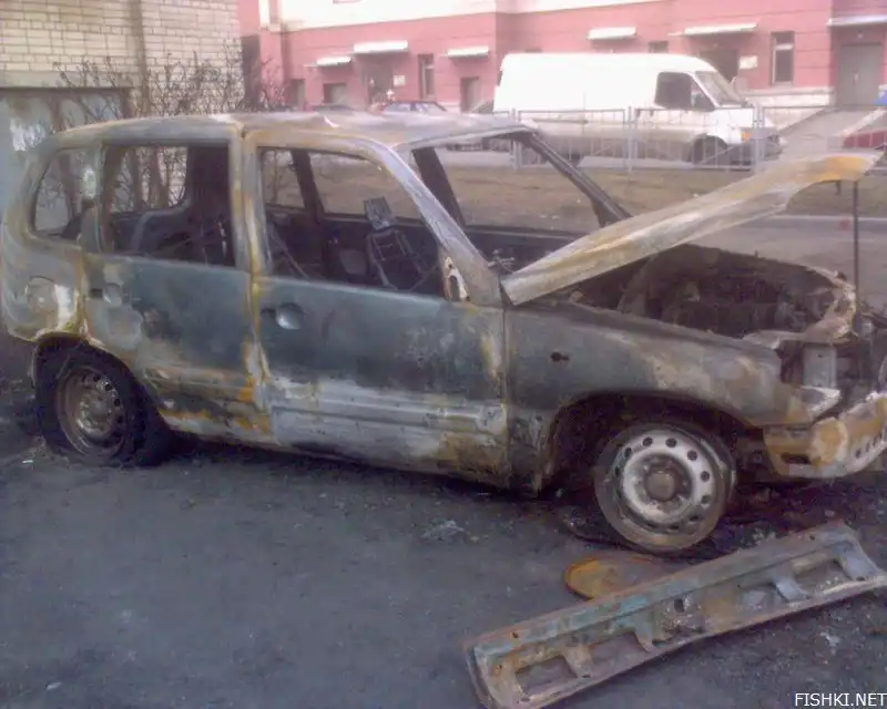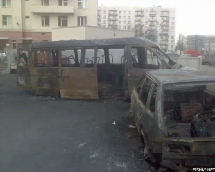Конкуренты перебивают бизнес. На днях в одном из дворов Питера сожгли маршрутку, прямо напротив одного из РУВД. Всего по городу их сгорело за ночь около 10. Результат перед вами. Кстати Шеви Нива и ВАЗ 2114 были новые.