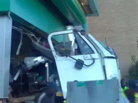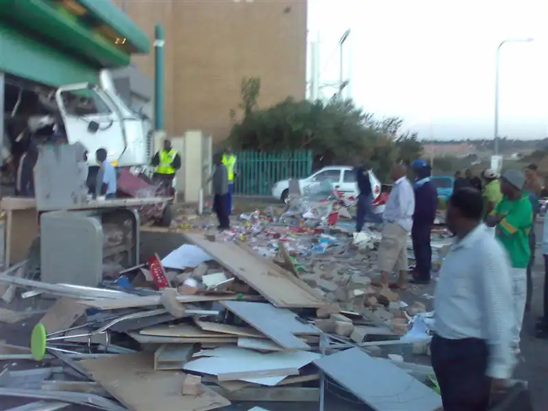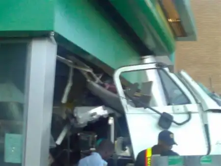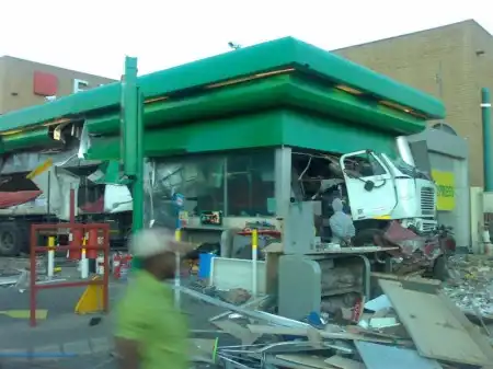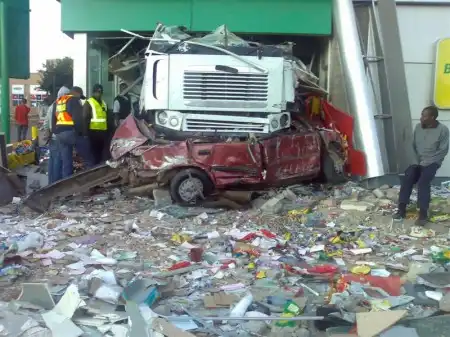 Фура врезалась в легковую машину а потом протаранила магазин на заправке, хорошо что не задела колонки.