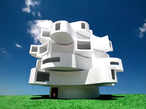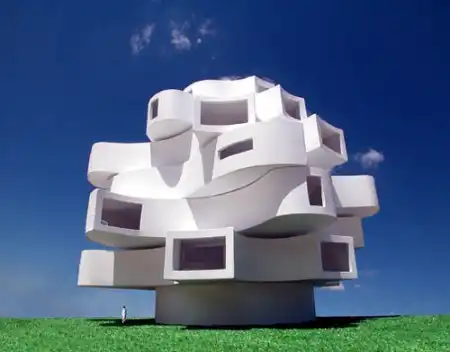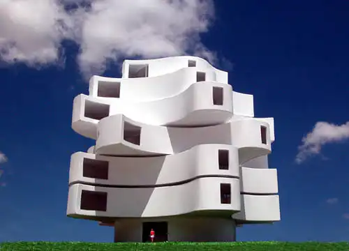 Среди массы интереснейших проектов, разработанных Майклом Янтценом (Michael Jantzen), особо интересен Wind Shaped Pavillion – павильон, вращающийся под действием ветра. Этот необычный архитектурный концепт состоит центрального цилиндрического блока и закрепленных на нем блоков-этажей.