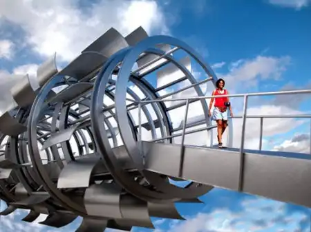 Не менее интересным и инновационным выглядит проект ветряного пешеходного моста (Wind Tunnel Foot Bridge): подвешенную в воздухе пешеходную дорожку охватывают ветряки, выполненные в форме колес, тоже способные обеспечить конструкцию автономной иллюминацией на всю ночь. Что ж, оригинальность дизайнерского решения имеет безусловную ценность сама по себе – вне зависимости от конечного выхода энергии.