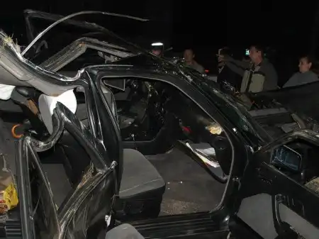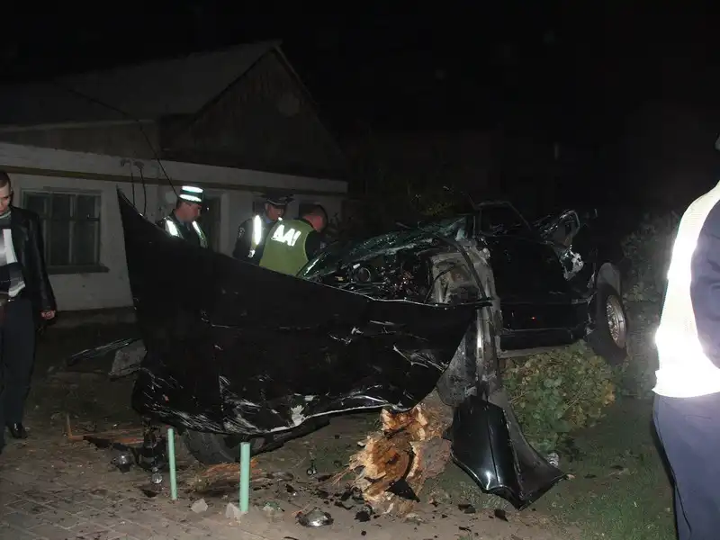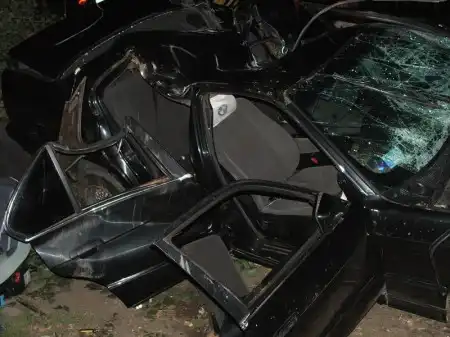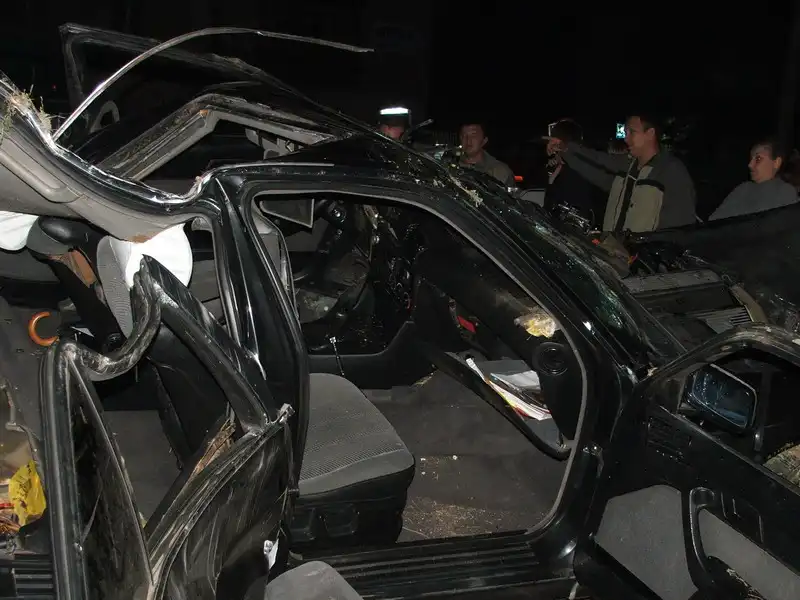 На скорости около 120 км машина начала рыскать и вылетела с дороги, снесла здоровенный тополь и развернувшись в воздухе снесла столб. крышей
