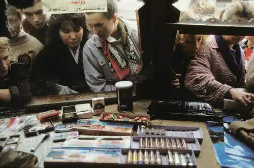 Не секрет, что в Советском союзе товары выдавали, только на складах и в коммерческих магазинах, так же по праву принадлежавших государству. На фото, мы наблюдаем, вид из окна коммерческого киоска, у которого скопилась большая очередь.