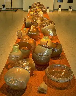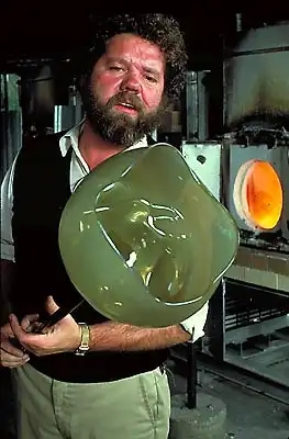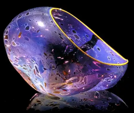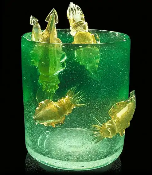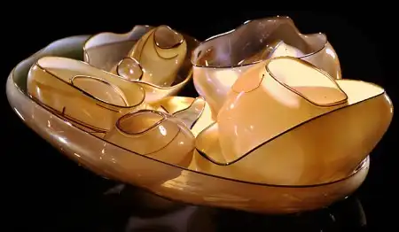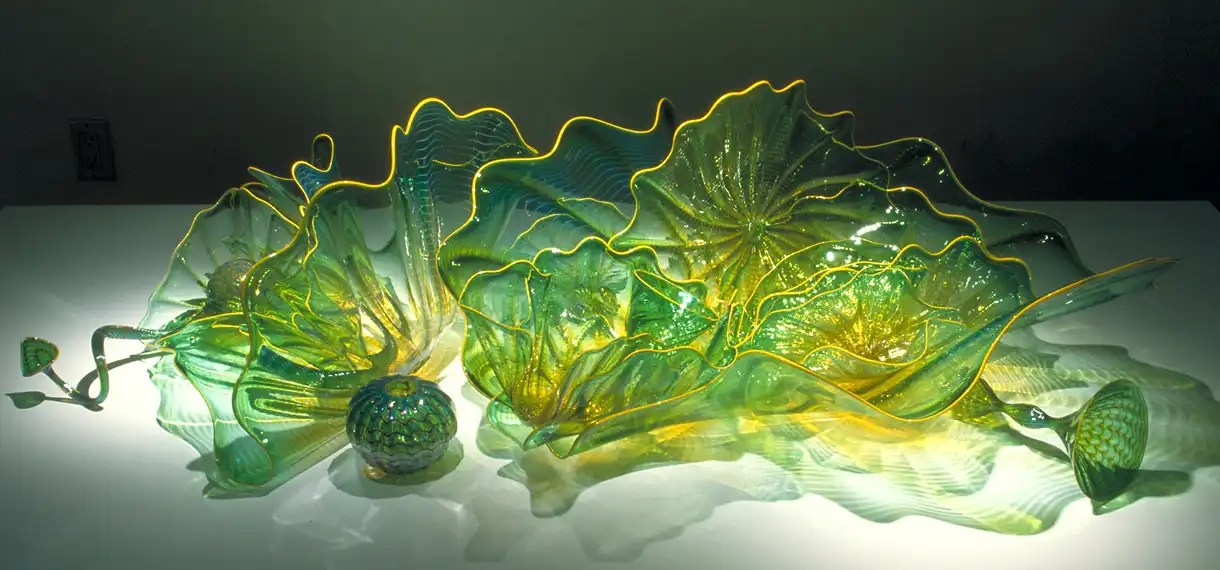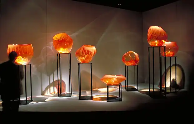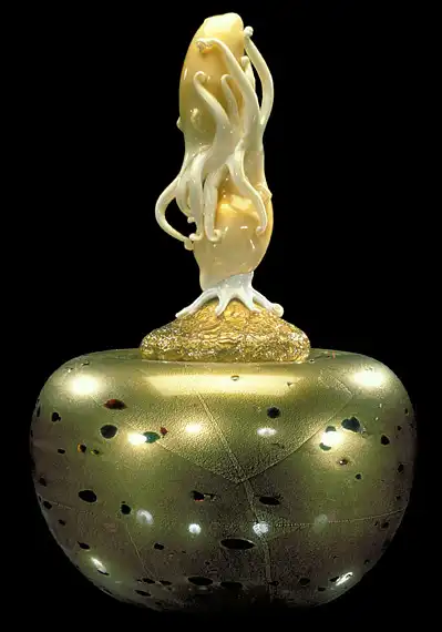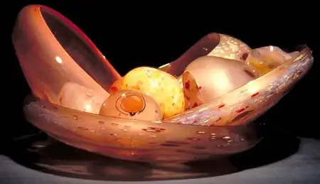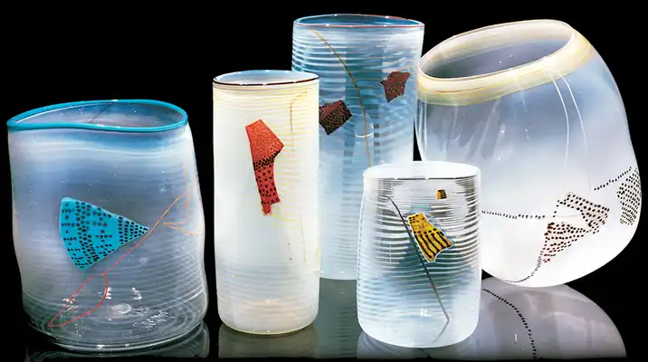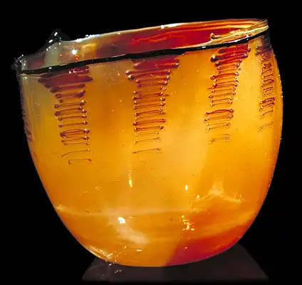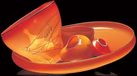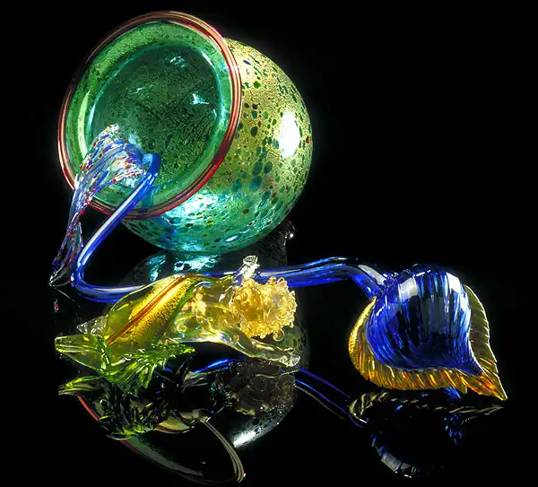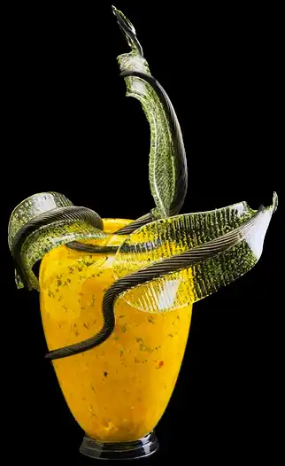 Дейл Чихули по праву считается одним из самых значительных современных художников. За 40 лет творчества он создал множество произведений искусства из стекла, и сегодня у него есть всё, о чем только может мечтать творец-репутация мастера, тысячи поклонников, постоянные экспозиции в лучших музеях мира, заказы от президентов, шейхов и голливудских звёзд. Из стеклянных объектов-тропических цветов и причудливых морских раковин-Чихули собрал целый потолок в знаменитом отеле Bellagio в Лас-Вегасе и повесил колоссальную люстру в багамском отеле Atlantis на Парадайз-Айленде. В 1968 году, будучи ещё совсем молодым человеком, Дейл посетил легендарную фабрику Venini в Венеции. С тех пор в палитре художника преобладают цвета, характерные для венецианского стекла-от сумеречно-серебряного до ярко-золотого и кроваво-красного. Уже приобретя всемирную известность, Чихули вернулся в пригород Венеции Мурано и вместе с мастером-стеклодувом Лино Тальяпетра создал «Венецианский цикл» ваз (Series of Venetians). «Мы с Лино отлично поработали,-рассказывает Чихули.-Всё время двигались вперёд, изобретая что-то новое. Ручки превращались в узлы, нежные тона сменялись ярким цветом, а сбалансированные формы-асимметрией». Каждая ваза Чихули обладает своим ярко выраженным характером, то гармонично вписываясь в интерьер, то агрессивно атакуя окружающую среду. Одна из главных заслуг маэстро состоит в том, что ему удалось преодолеть технические ограничения, связанные с хрупкостью стекла, и буквально совершить технологическую революцию.