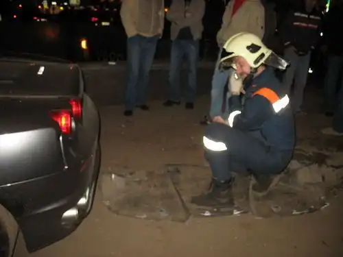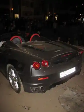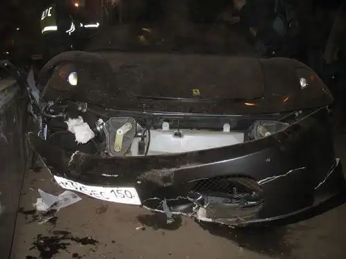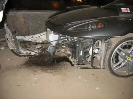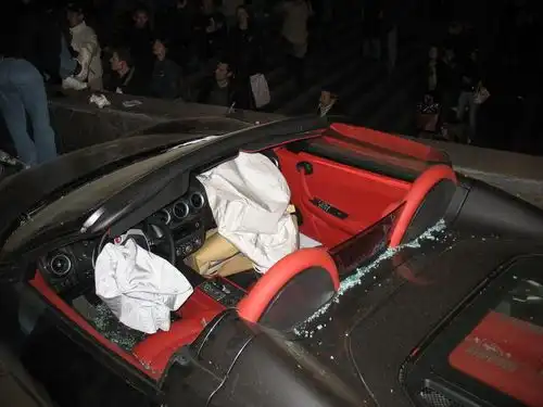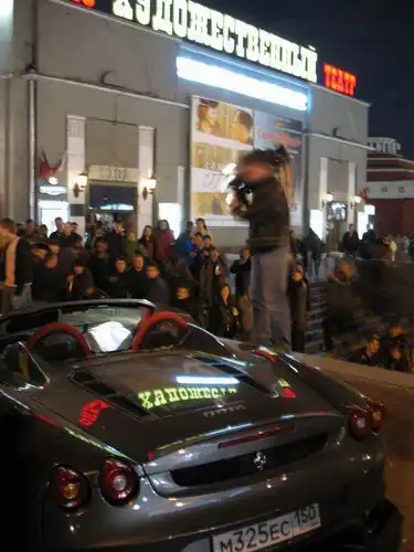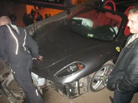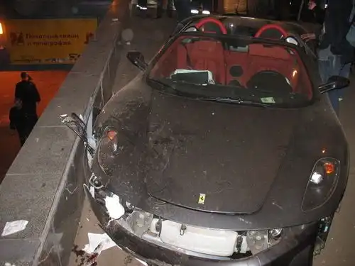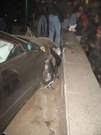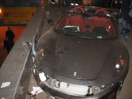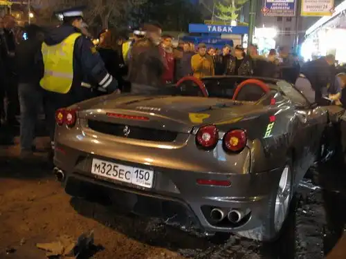 Вчера в 21:15 рядом с метро Арбатская. По словам очевидцев, темно-серый феррари управляемый мужчиной с молодой пассажиркой на борту, видимо, не справился с управлением и врезался в конструкцию пешеходного перехода. В результате аварии пострадал 1 человек (на фото он сидит на парапете пешеходного перехода).