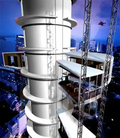 Ещё авторы этого проекта гордятся тем, что предусмотрели технологию быстрого возведения башни со сборкой этажей прямо на месте. Краны и прочая традиционная строительная техника потребуются строителям лишь при возведении центрального ядра здания, вокруг которого и будут крутиться этажи и ветровые турбины.