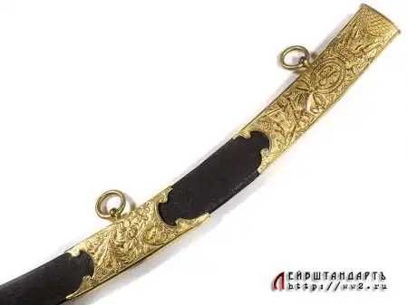 Ножны деревянные, проклеенные изнутри красным бархатом и обтянутые снаружи выкрашенной в черный цвет мелкозернистой шагреневой кожей ската либо акулы. Бронзовый прибор состоит из устья, широкой гайки и наконечника, покрывающих большую половину поверхности ножен. Они украшены растительным орнаментом в стиле «ампир», изображениями военной арматуры и геральдическим щитом с монограммой английского Императора и девизом: “Honi. Soit. Qui. Mal. Y. Pence” с обеих сторон устья ножен. Устье и гайка снабжены двумя кольцами для подвешивания, а наконечник заканчивается стальной накладкой аккуратно прикрепленной для предотвращения ударов о землю при ношении. Все бронзовые части прибора ножен также покрыты позолотой, полностью сохранившейся.
