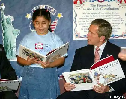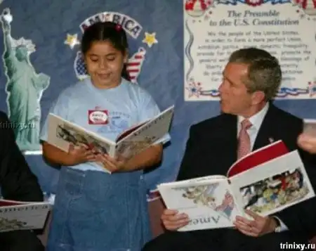 История: Джордж Буш держит книгу и телефонную трубку вверх ногами.