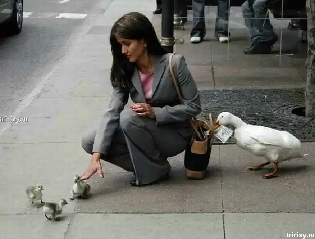 История: Утка ворует деньги, пока утята отвлекают женщину