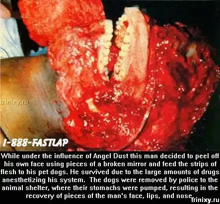 Он рассказывает про человека, который под действием наркотика PCP (ПиСиПи) срезает себе лицо и скармливает его своим собакам. Из-за большого количества наркотика в крови, он выживает.