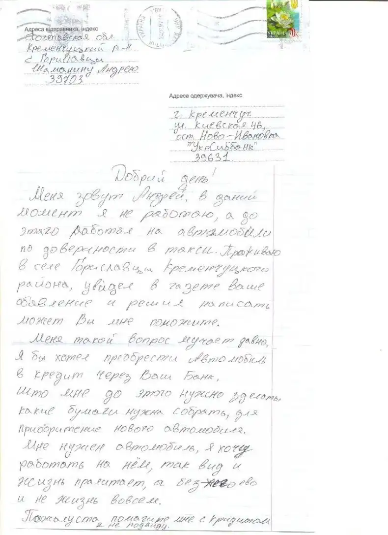 Плюс одно письмо в банк о выдаче кредита на приобретение авто, на нем аж грустно стало(