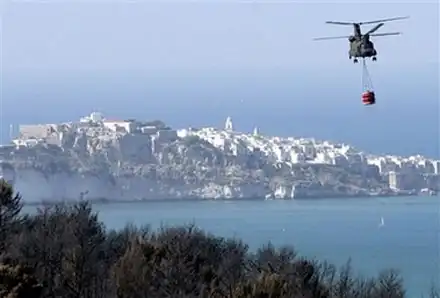 Вертолет итальянских ВМС, взяв в контейнер воду из Адриатического моря, направляется к месту пожара. (AP Photo)