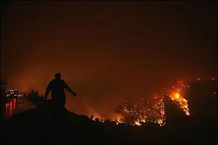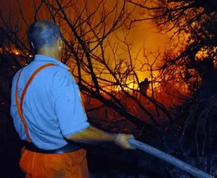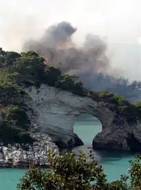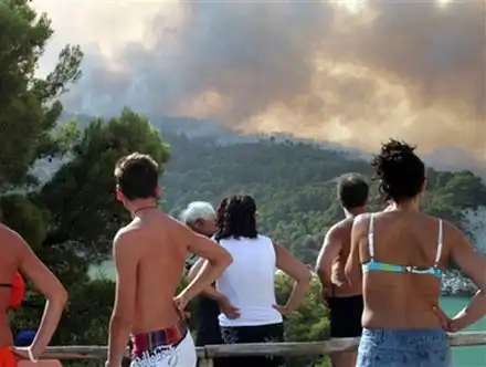 Пожар близ г. Пескичи (полуостров Гаргано на Адриатическом побережье), где сотни туристов и жителей вынуждены были оставить дома при приближении сильного пожара. (AP Photo)