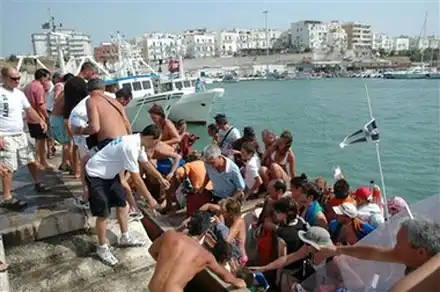 Туристы и местные жители спасаются на лодках в г. Пескичи (полуостров Гаргано на Адриатическом побережье). (AP Photo)