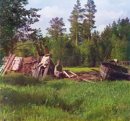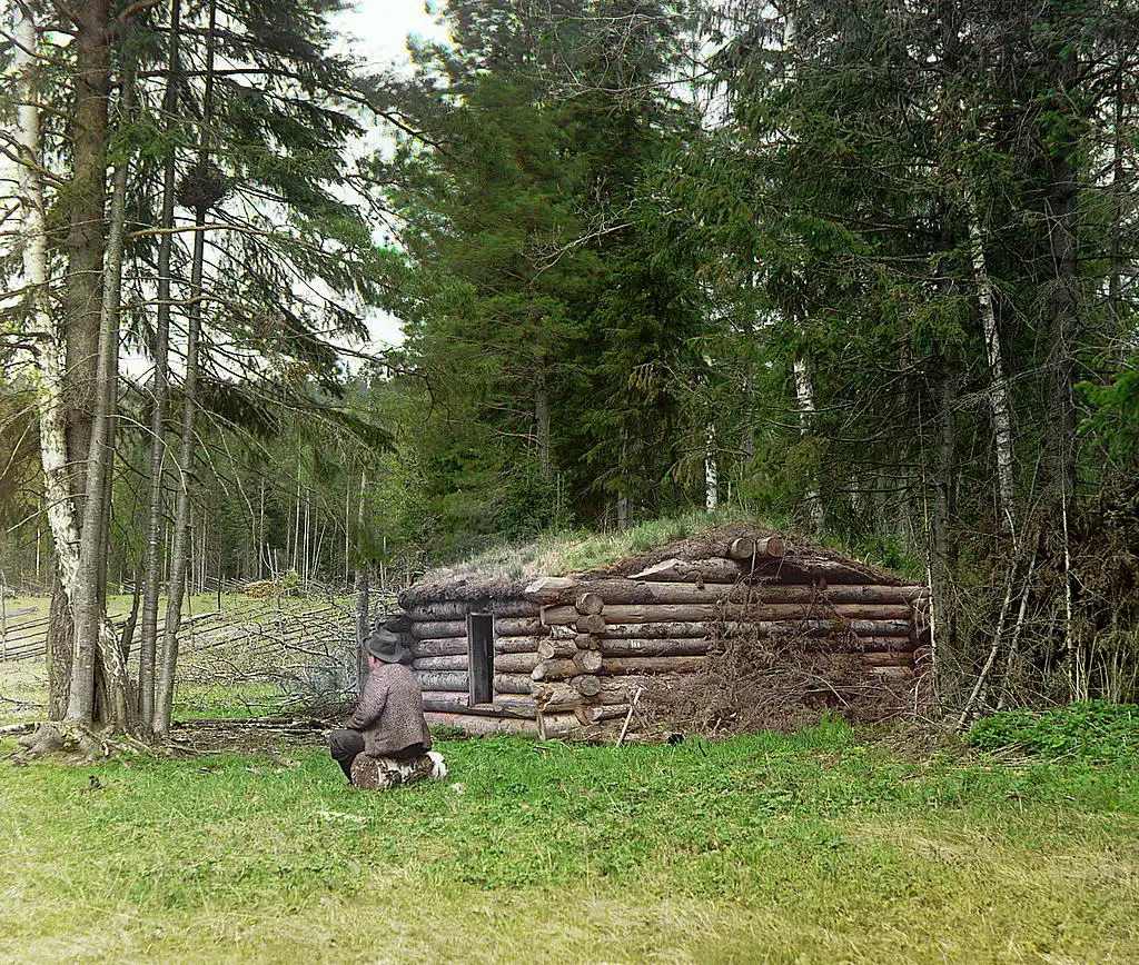 Курная избушка в лесу для дровосеков и курья (выжигание угля) 1912