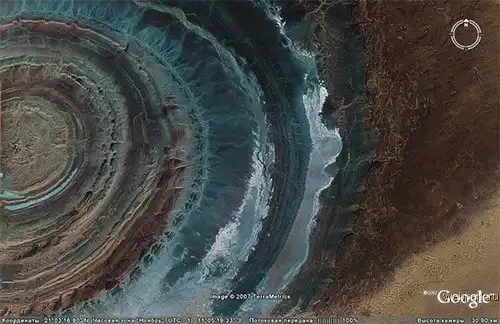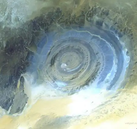 А это - структура Гуэль–Эр–Ришат, расположенная в пустыне Сахара на территории Мавритании, хорошо заметна из космоса благодаря своим огромным размерам — ее диаметр составляет почти 50 километров. Время возникновения самого древнего кольца – 0,5–0,6 миллиардов лет назад.