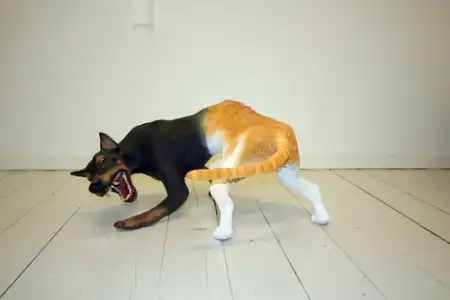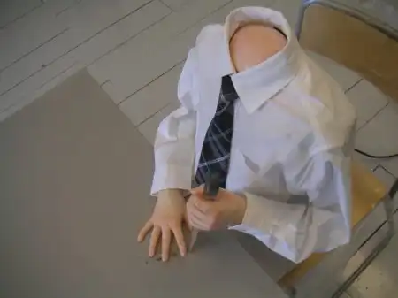 Безголовая механическая фигура семилетнего мальчика играет в безумную игру с кухонным ножом.
