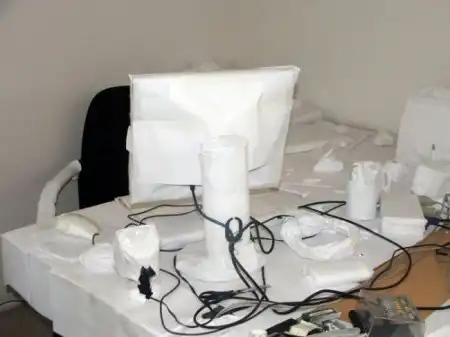 Очередной офисный прикол: все предметы в офисе обмотали бумагой, времени наверное потратили уйма. Жаль мы не увидим реакцию хозяина рабочего место, но, я думаю, игра стоила свеч.