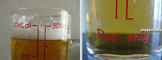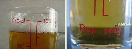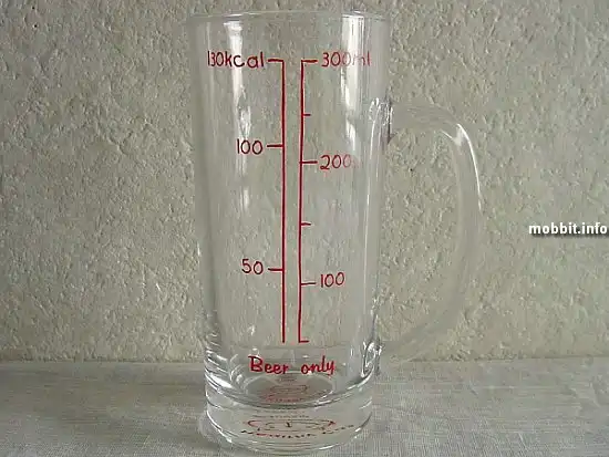 Тем, кто следит за своим весом и здоровьем, вряд ли понравится пить пиво из такой кружки, впрочем, она как раз для того и предназначена – окончательно отбить охоту и всякую радость от распития любимого напитка, потому что будет каждый раз напоминать, сколько калорий вы употребили вместе с пивом :) А судя по разметке на ней, в 300 мл пива содержится 130 ккал. Конечно, количество употребленных калорий можно прикинуть и в уме, без всяких надписей, но вы же не будете делать это каждый раз…а такая кружка будет служить ходячим напоминанием. Но признайтесь себе честно, неужели это сможет вас остановить? :) А вот сознательных японцев, надо полагать, останавливает, раз они производят такое :)