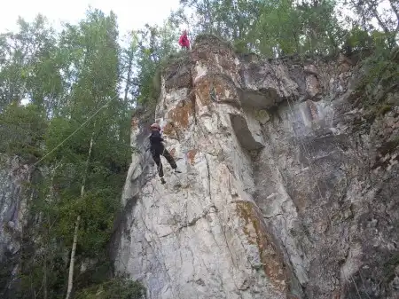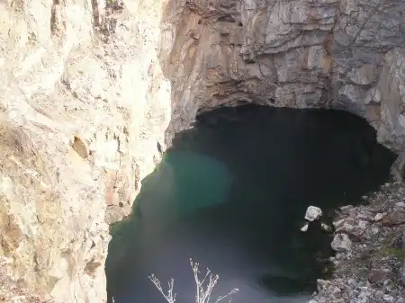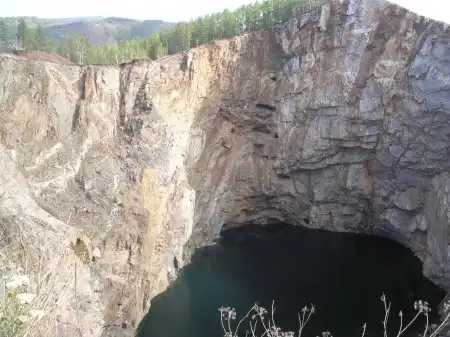 Туимский провал. Когда то это были сеть шахт, после, толи взрыва, толи закрытия этих шахт их взорвали и образовался вот такой милый провал.. Глубина его до озера 800 м. В диаметре провал достигает 1500 м.