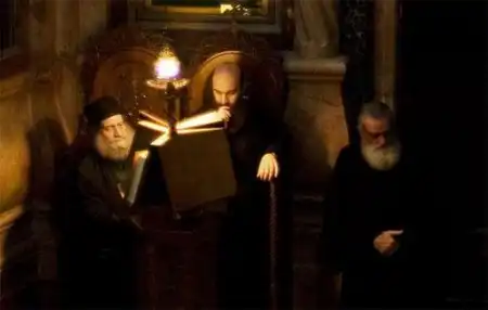 Три ортодоксальных священника молятся в Храме Гроба Господня...
