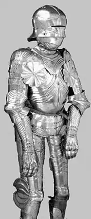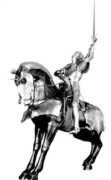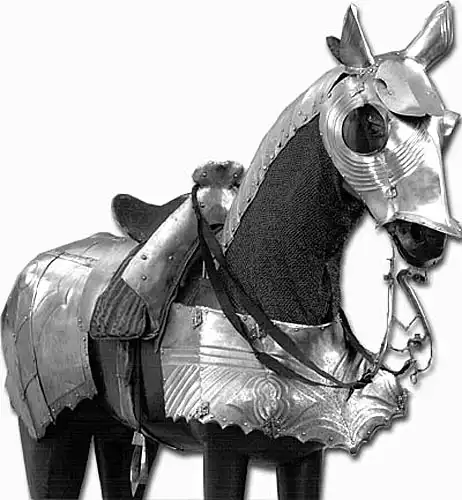 Весил такой доспех около 25 килограммов. (Комплект из кольчуги, лат для лошади и рыцаря весит до 90 килограмм).
