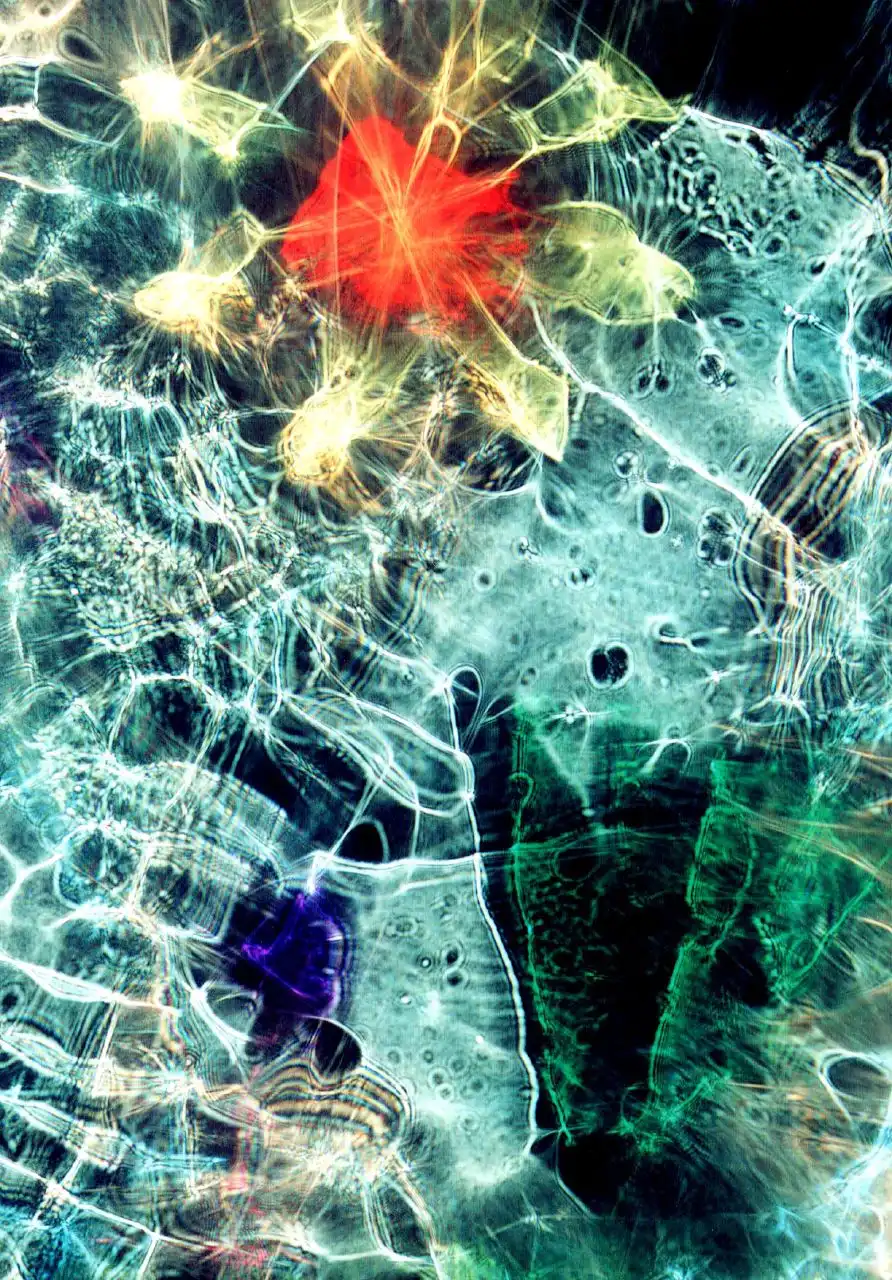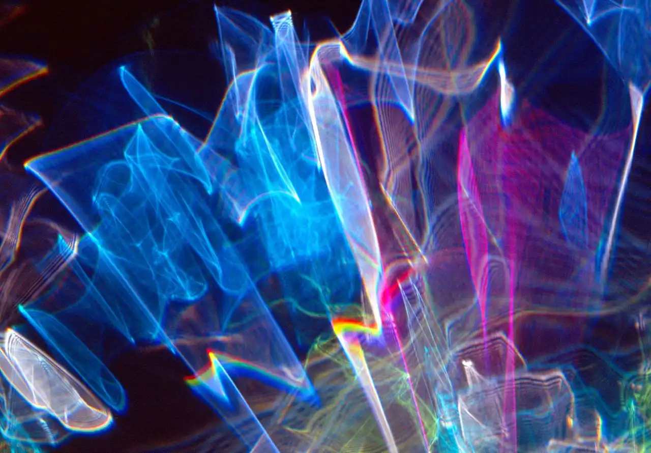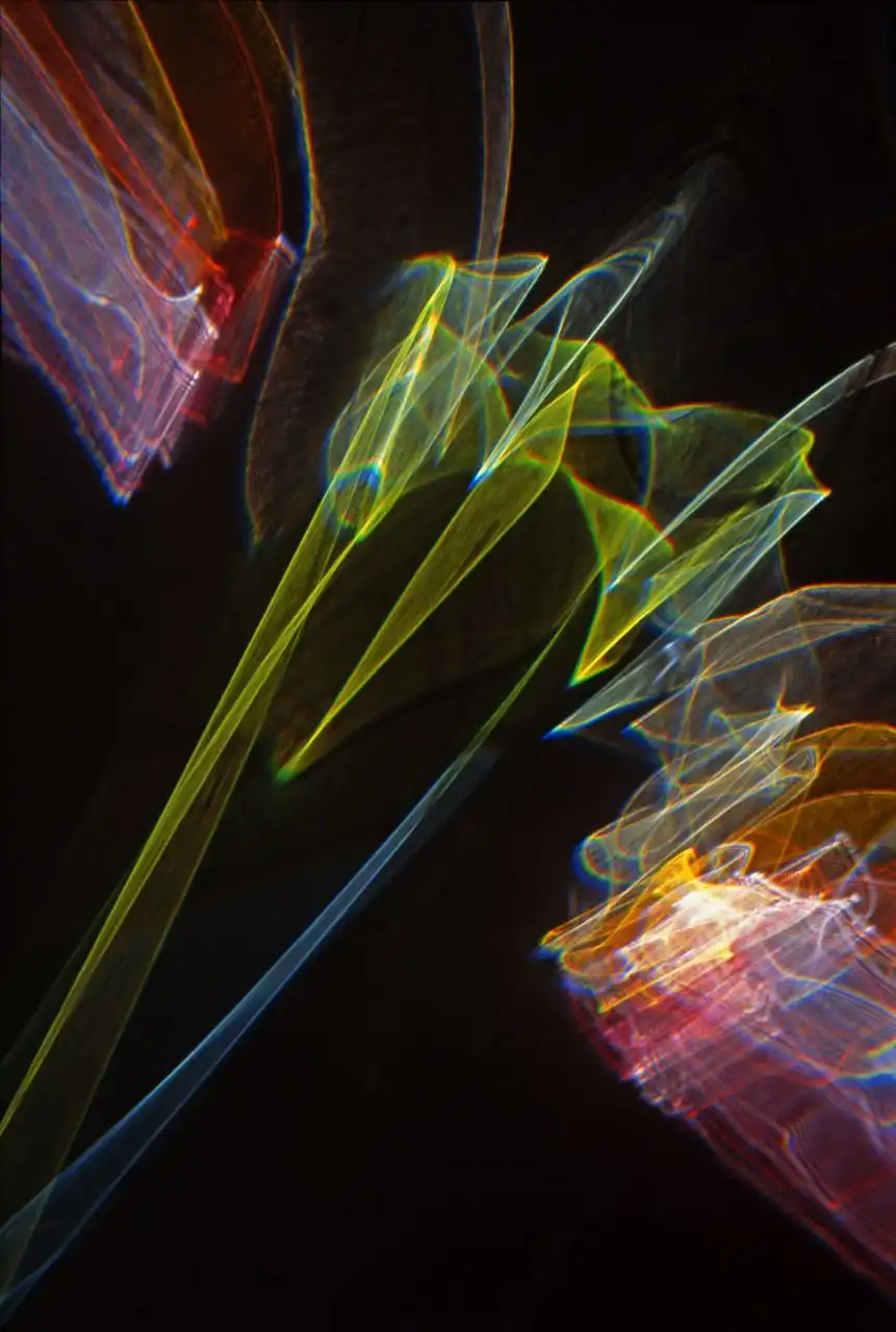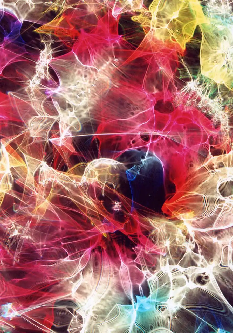 Как удалось уловить со слов автора, это - аналоговые изображения переломлений лучей света, проходящих сквозь различные прозрачные объекты. Картинка фиксируется непосредственно на 35мм пленку камерой без объектива: на его месте сам объект. Никакого фотошопа. Цвет добавляется непосредственно в материал.