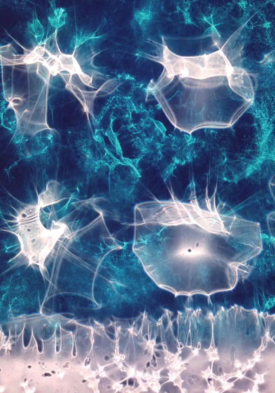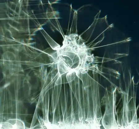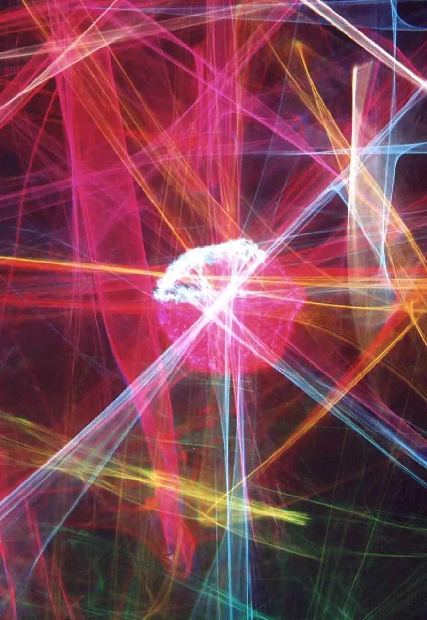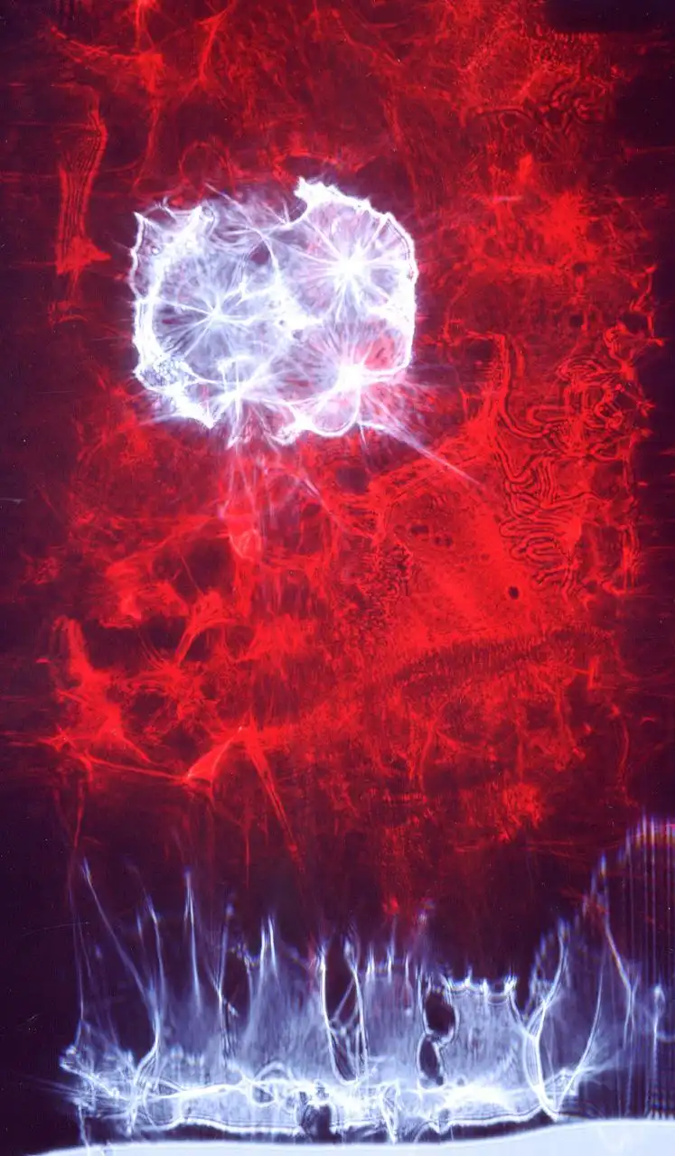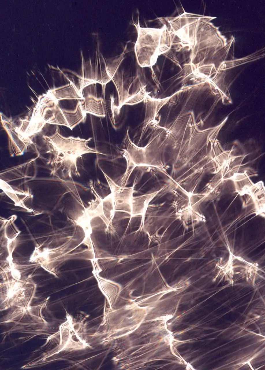 Как удалось уловить со слов автора, это - аналоговые изображения переломлений лучей света, проходящих сквозь различные прозрачные объекты. Картинка фиксируется непосредственно на 35мм пленку камерой без объектива: на его месте сам объект. Никакого фотошопа. Цвет добавляется непосредственно в материал.