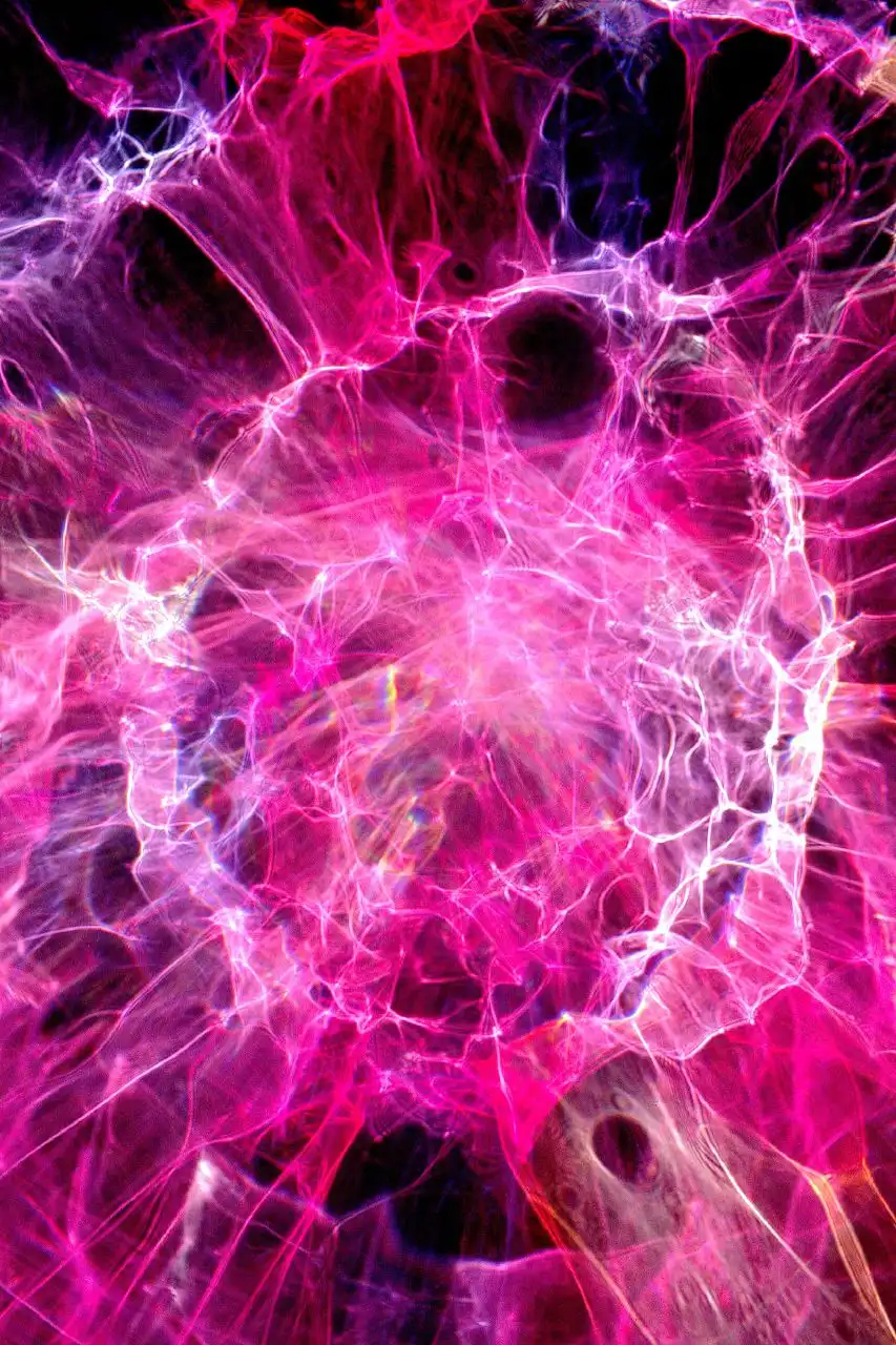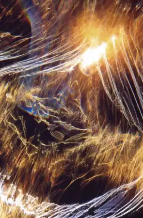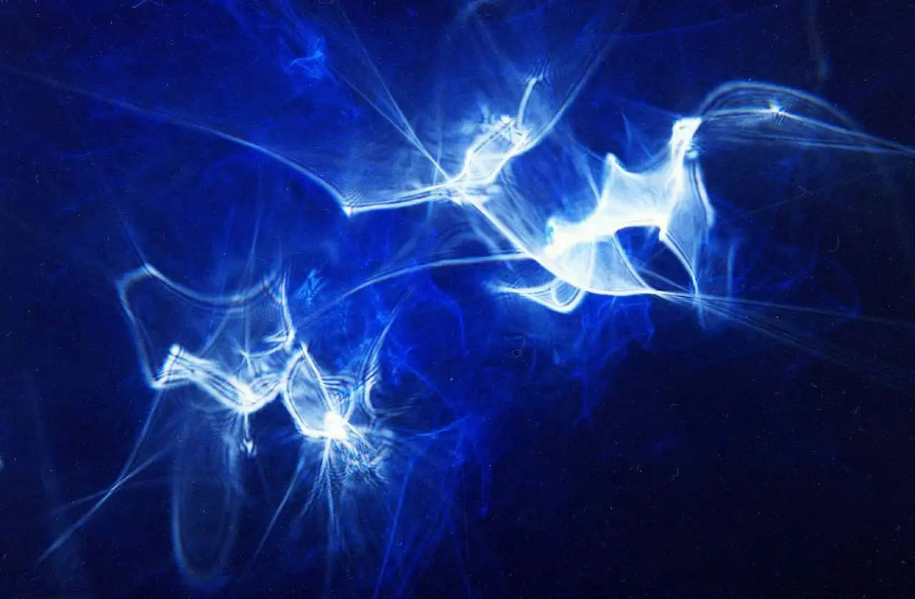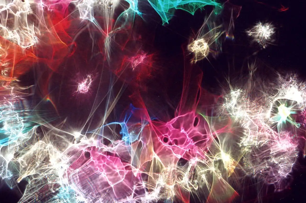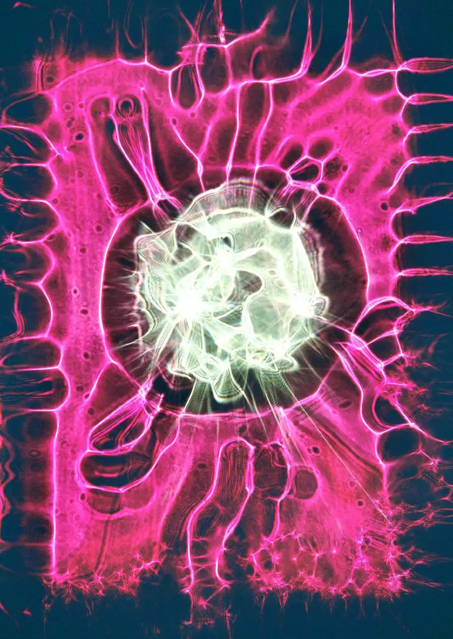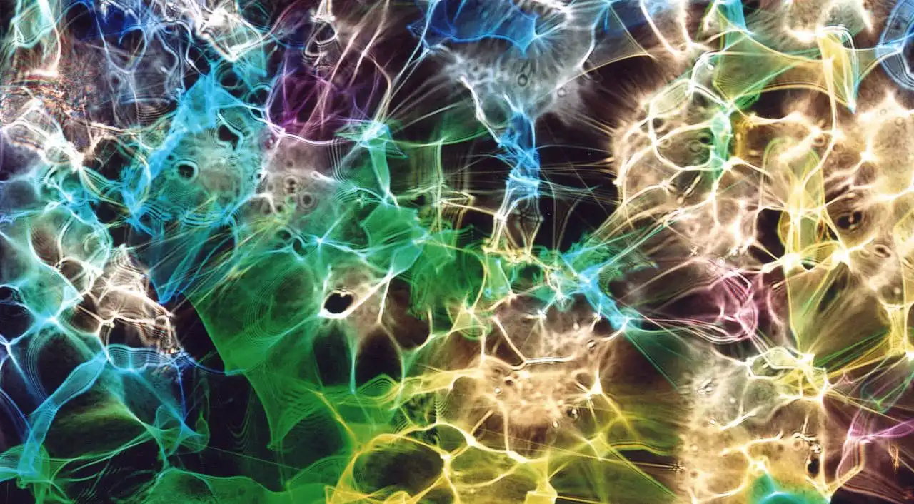 Как удалось уловить со слов автора, это - аналоговые изображения переломлений лучей света, проходящих сквозь различные прозрачные объекты. Картинка фиксируется непосредственно на 35мм пленку камерой без объектива: на его месте сам объект. Никакого фотошопа. Цвет добавляется непосредственно в материал.