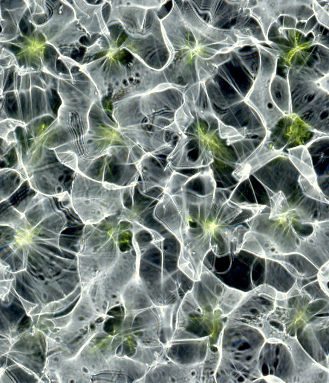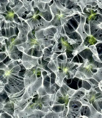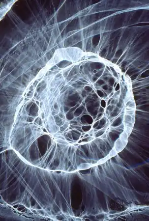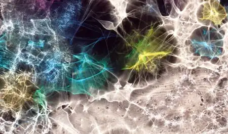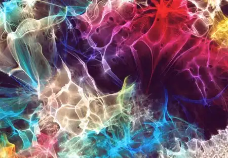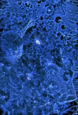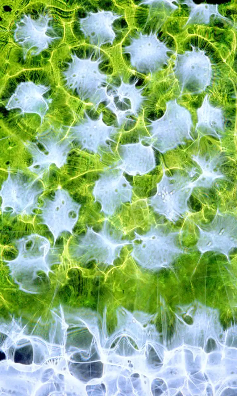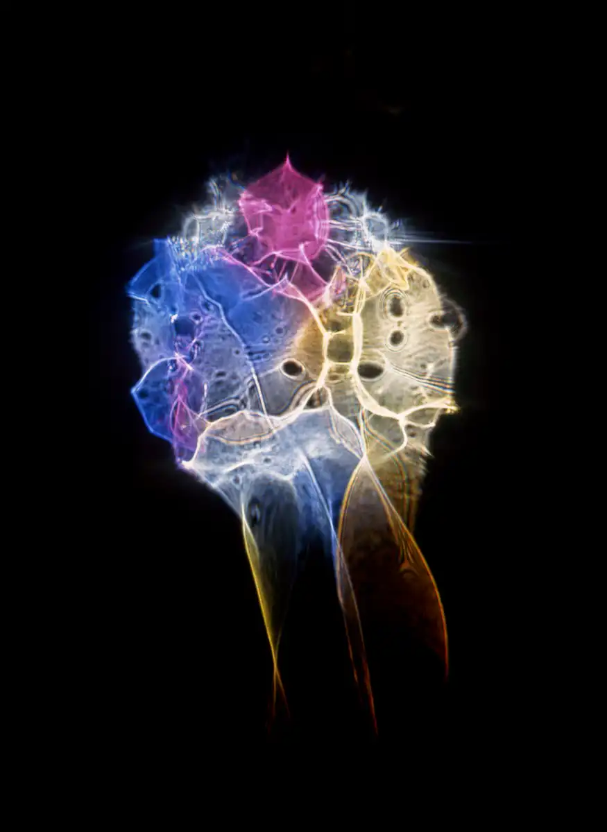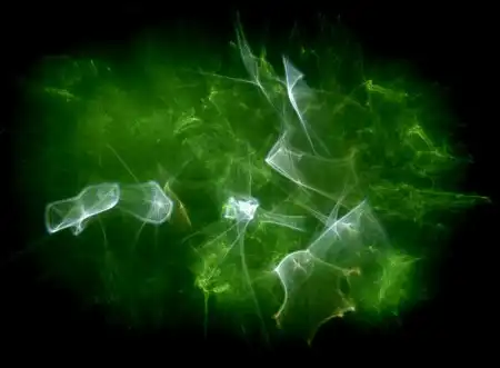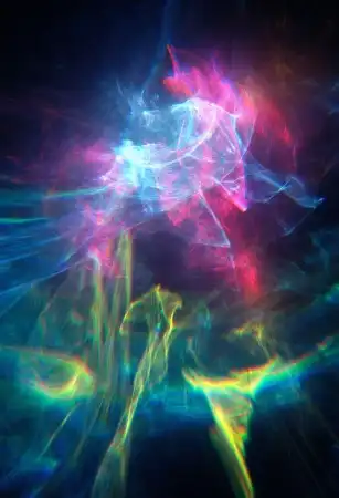 Как удалось уловить со слов автора, это - аналоговые изображения переломлений лучей света, проходящих сквозь различные прозрачные объекты. Картинка фиксируется непосредственно на 35мм пленку камерой без объектива: на его месте сам объект. Никакого фотошопа. Цвет добавляется непосредственно в материал.
