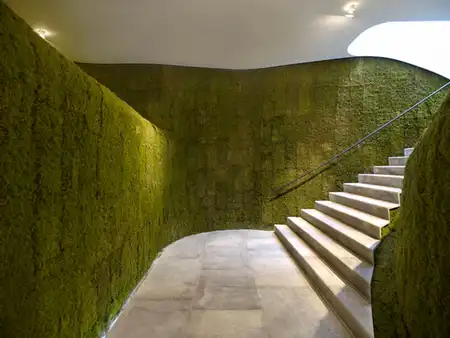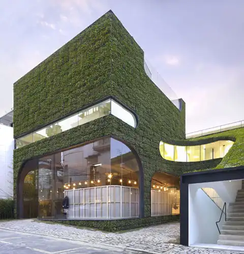 Большая часть фасада покрыта настоящими растениями, а кроме магазина одежды на «зеленом островке» Сеула также находится ресторан.