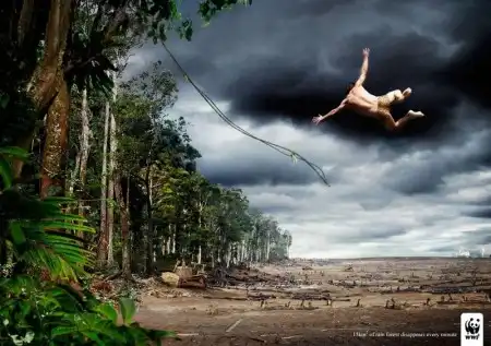 Плакат фонда защиты дикой природы. «Каждую минуту исчезают 15 кв. км тропического леса»