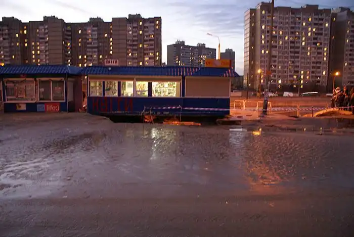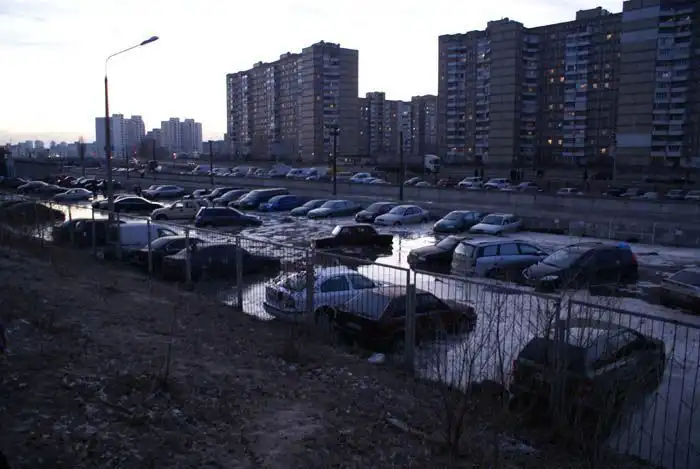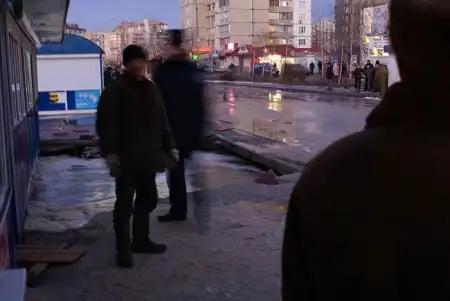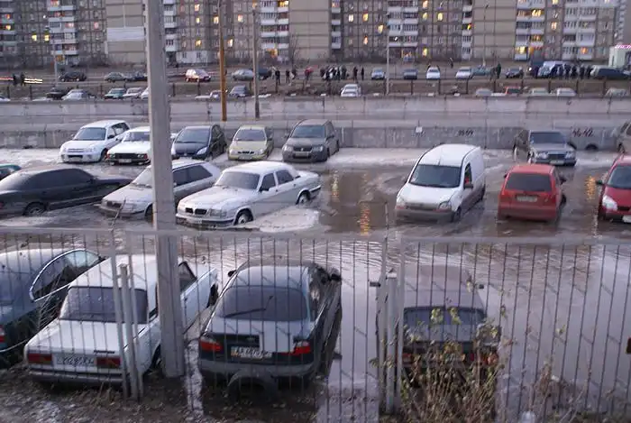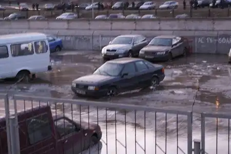 Что-то прорвало. Вода стоит на стоянке в огромном количестве и в нее спускаются с горки небольшие ручейки с песком, постепенно закапывая машинки, лишает их возможности вырваться из этого плена. Люди вынуждены в мороз выкапывать своих ласточек, а некоторые даже через забор перепрыгивают, спеша на помощь к своему верному товарищу. ГАИ перекрыло движение и создалась пробка во дворах. Владельцы киосков поспешно эвакуируют товар, киоски стоят на кроях пропасти…